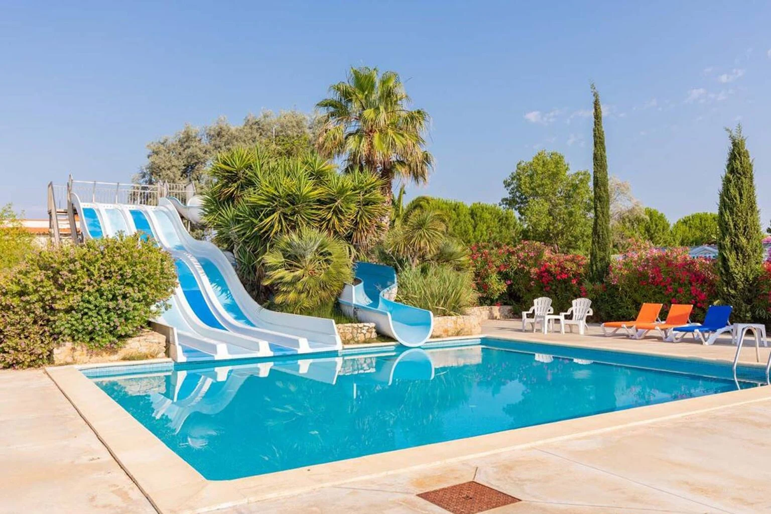I kan derfor roligt læne jer tilbage i liggestolene omkring poolen og nyde solen eller skyggen fra parasollen i ro og mag - eller hvorfor ikke give jer i kast med en af de store eller små vandrutsjebaner og vandlegepladsen, der ikke kan andet end at få jer til at grine. Bemærk: Det er kun tilladt at bære klassisk badetøj i poolen. En gang om ugen kan man tilmelde sig introduktionskursus i scuba diving.