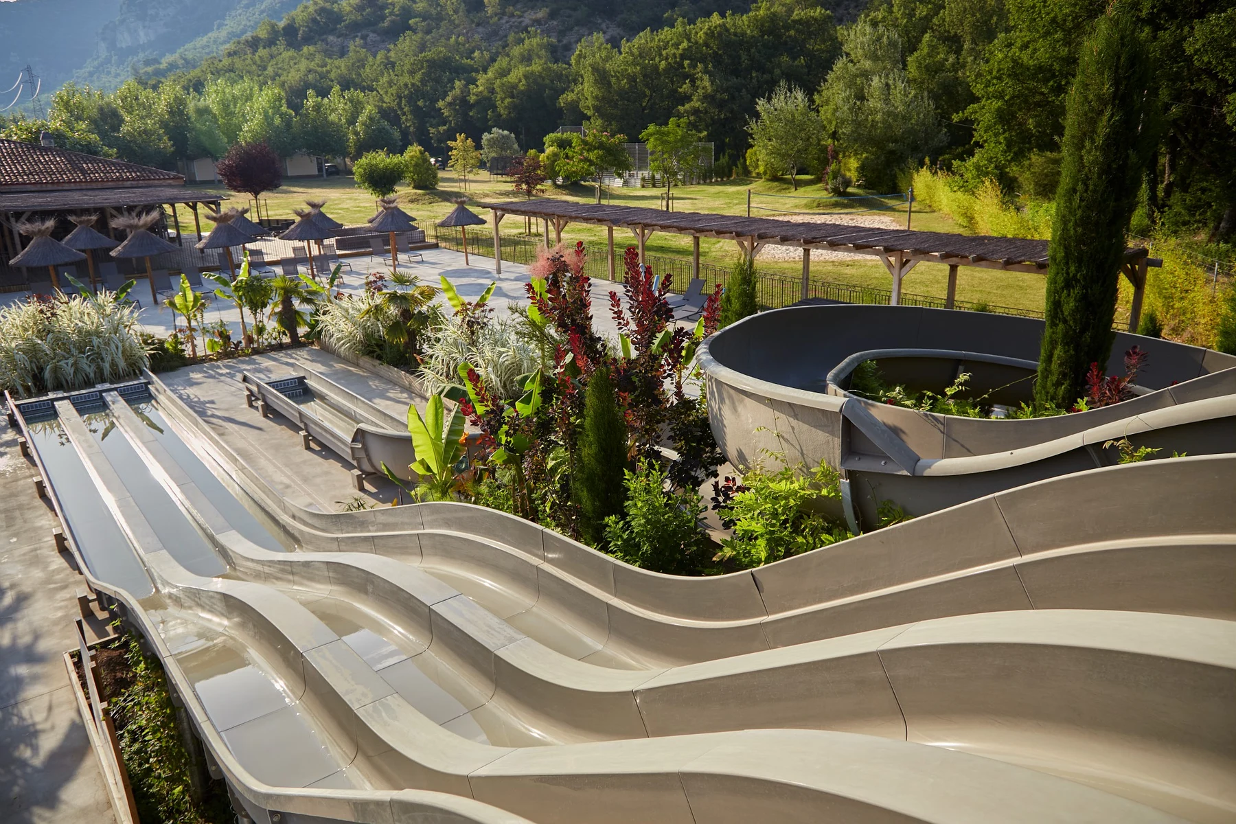 Marvilla Parks Verdon Parc er et sandt paradis for vandelskere. Campingpladsen byder på et imponerende poolområde, der giver en tropisk atmosfære med stråparasoller og en sandstrand, der omkranser en af de tre udendørs pools. Her kan I finde palmetræer og solsenge, der indbyder til afslapning under solen. En af de udendørs pools er overdækket og opvarmet, hvilket betyder, at I kan nyde en svømmetur uanset vejret. Børnefamilier vil elske børnepoolen med splash park og det spændende rutsjebane-tårn, som sikrer timevis af sjov for de mindste.