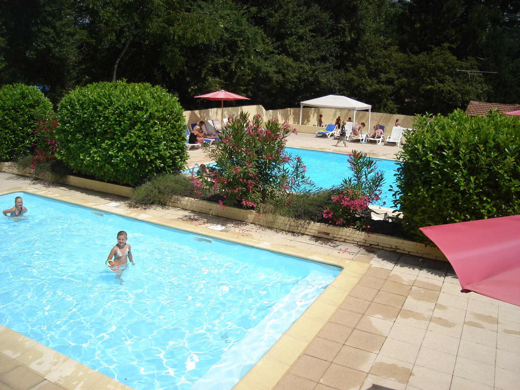 Campingpladsen har et afslappende poolområde, som er omgivet af træer, hvilket både giver lidt skygge men også hyggelig stemning. Der er en større swimmingpool til voksne og erfarne svømmere, mens børnene kan bade lige ved siden af i det separate børnebassin. På Camping Chateau Le Haget finder I ligeledes en sportbane, bordtennis, petanque og mulighed for at deltage i forskellig underholdning i løbet af campingsæsonen.