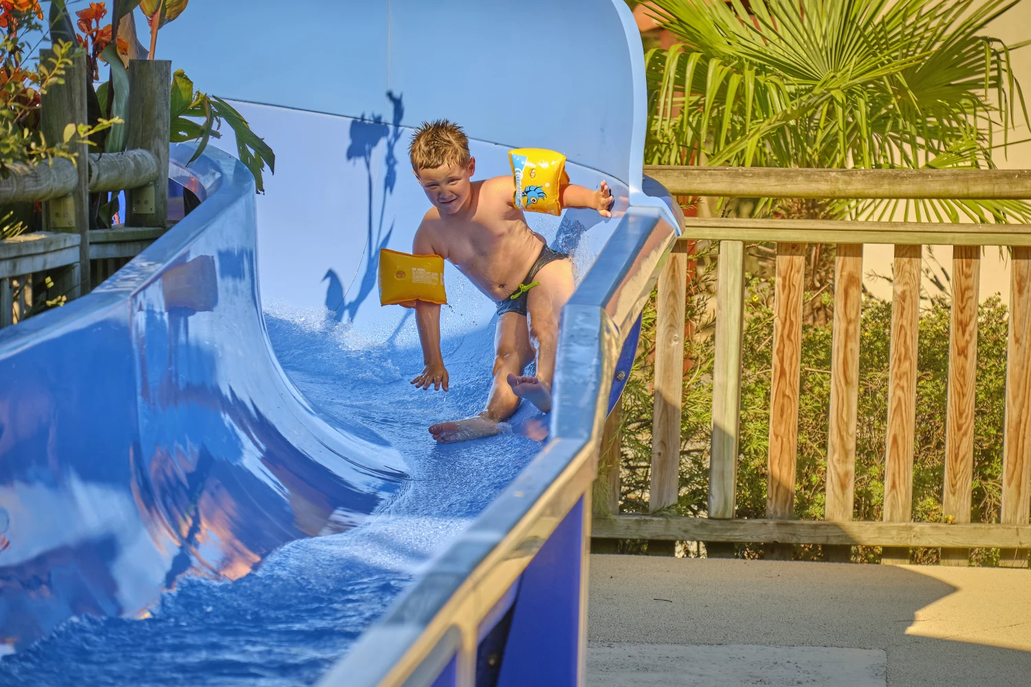 Pool området på Camping Coeur de Vendée er det naturlige samlingspunkt på pladsen, når man ikke lige er ude og "opleve" det fantastiske Vendée område. Her kan der svømmes, leget og solbades, børnene vil elske at suse ned af den 50 meter lange vandrutsjebane. Har I lyst til at nyde en frisk dukkert i Atlanterhavets brusende bølger, og sole jer på den fine stand strand, så finder I gode sandstrande ca. 70 km herfra.