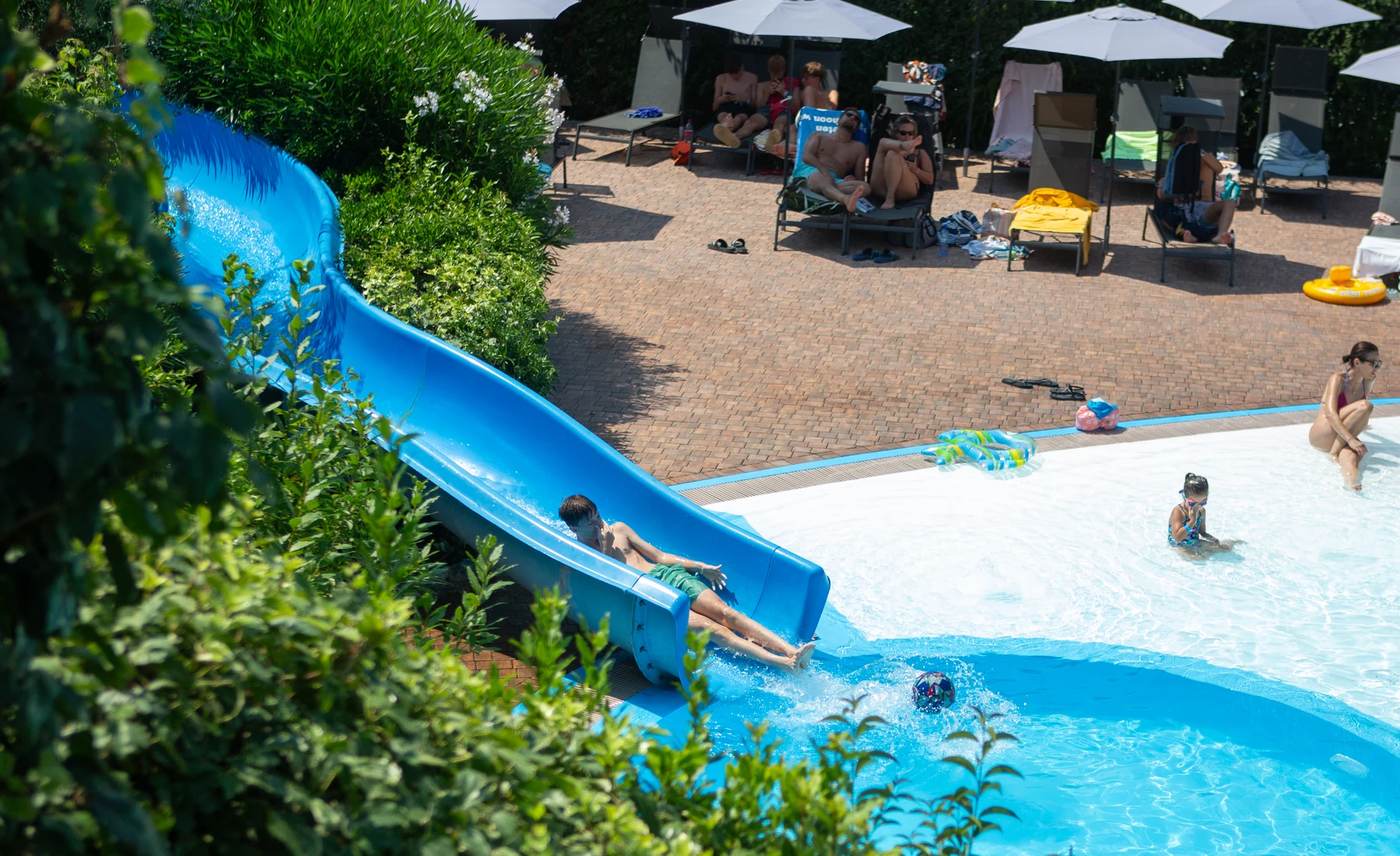 Campingpladsens store poolområde er noget for enhver! Her er mange solsenge til dem, der vil nyde solen og slappe helt af, både ved poolen samt på et lækkert græsareal. Swimmingpoolen er hele 325 m2 og der er endvidere et separat børnebassin. Fra campingpladsen er der direkte tilgang til en blød sandstrand med en fantastisk udsigt over Iseosøens smukke, bjergede landskab.