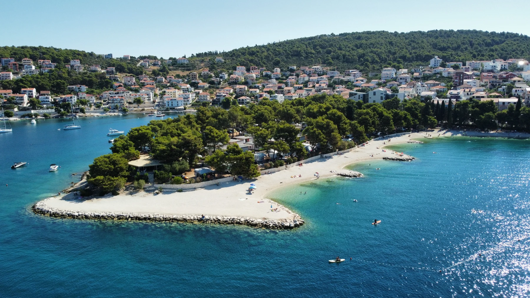 Camping Rozac er omgivet af en tæt pinjeskov, hvilket giver skyggefulde områder, når solen står højt på himmelen. Campingpladsen er beliggende på den kroatiske ø Ciovo, og byder på masser af sol og et skønt azurblåt hav, hvor I kommer til at tilbringe mange af feriens timer. Her er masser af aktiviteter og seværdigheder for hele familien.