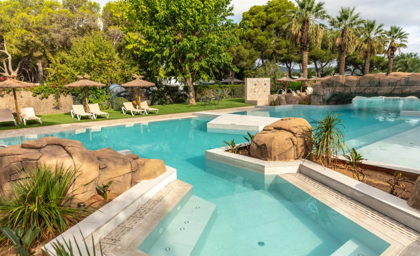Til enhver ferie i varmen skal hele familien kunne blive kølet af! Campingpladsens poolområde har en lækker saltvandspool med en hyggelig børnepool. Saltvandet irriterer hverken øjne eller hud så I kan roligt lade familiens vandglade medlemmer bruge masser tid i poolen. Familiens strandløver skal kun bevæge sig ca. 900 meter for at få sand mellem tæerende og bade i Middelhavet. Både på stranden og ved poolen er der gode muligheder for at solbade.