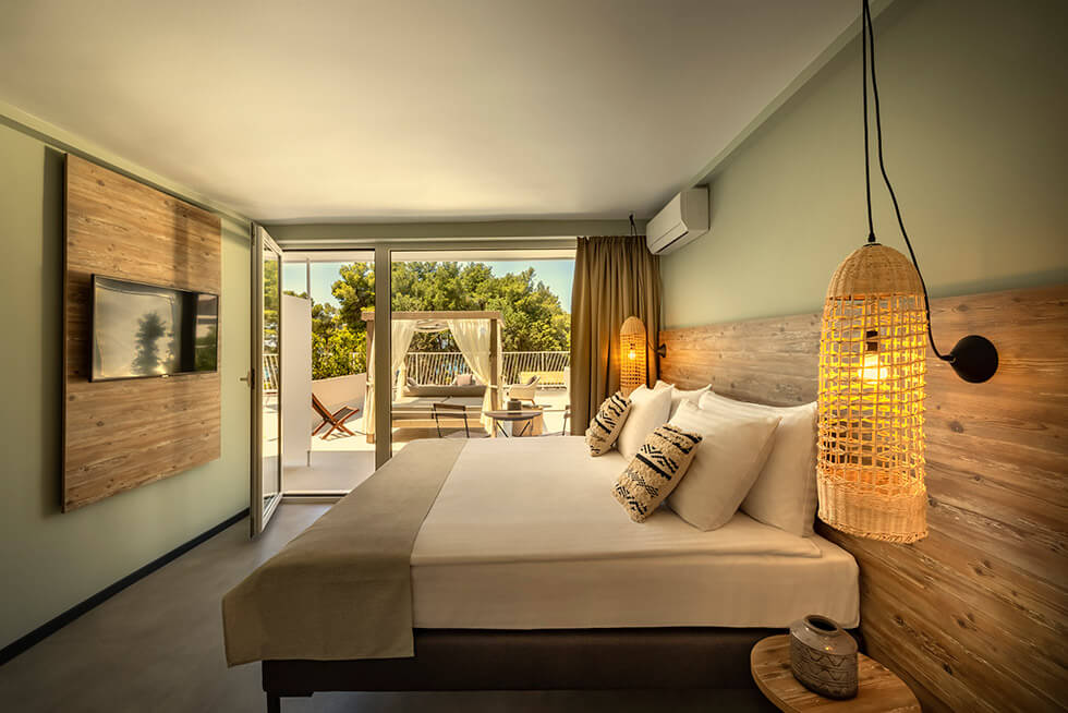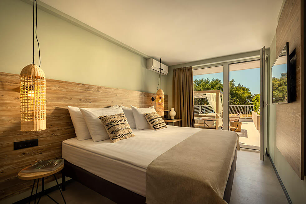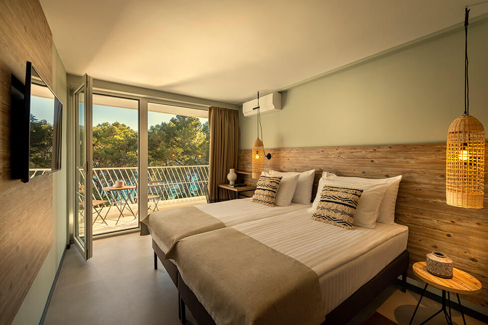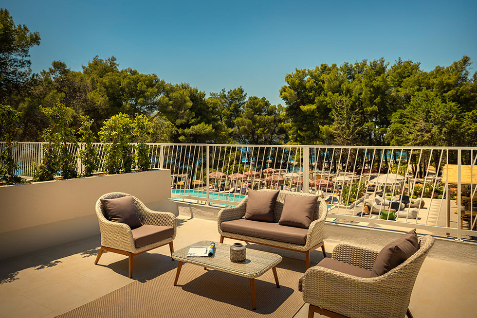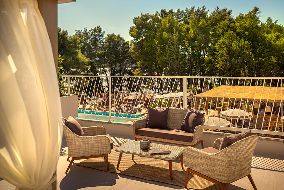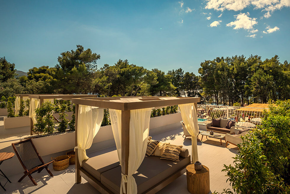 Den lækre poolbar serverer signaturcocktails med urter fra Hvars natur, og musikken leveres af både live-DJs og lokale bands. En boblende whirlpool og hyggelige liggestole ved stenstranden – nogle med baldakiner – indrammet af duftende fyrretræer gør oplevelsen komplet. Her får du det bedste fra både pool- og strandlivet i ét.